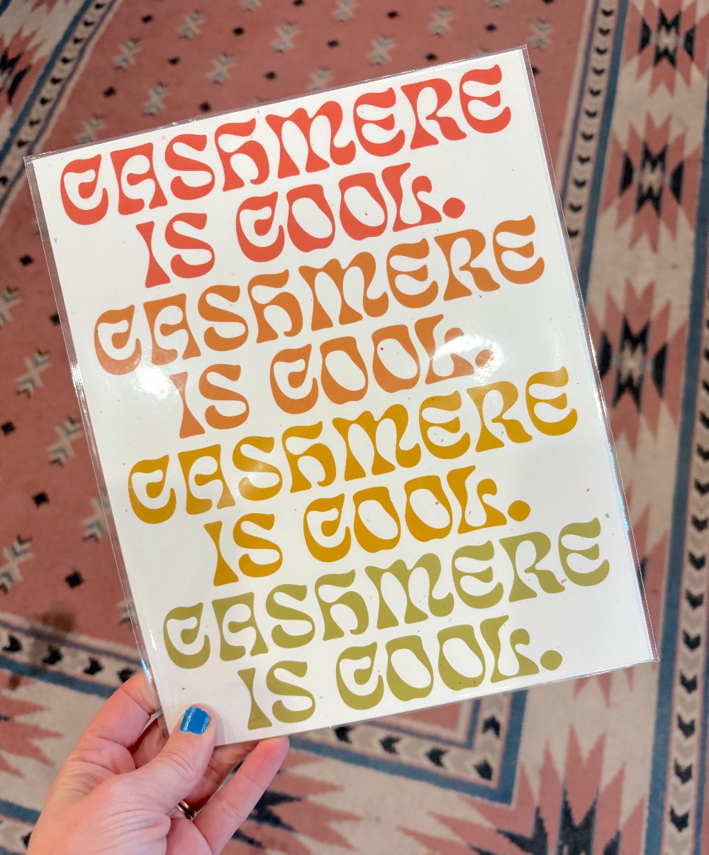 Cashmere is cool! The cutest multi tone print of our favorite slogan. 8"x10" on rainbow speckled paper. Comes in plastic sleeve with board backer, ready to frame & hang.