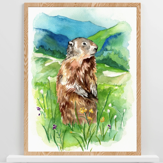 11x14 Marmot Watercolor Print on high-quality, heavy stock paper. Features a print of the original painting by Emma Baldwin.