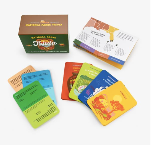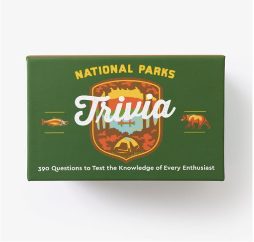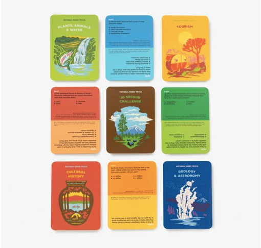 The cards include 390 questions on 195 cards and five 10-second Lightning challenge cards. The four subject categories—Plants, Animals, and Wildlife (PAW), Geology and Astronomy (GEO), Visitation, Famous Events and Hikes, and Park Superlatives (TOUR), and Cultural History and Geography (HIST)—span every single national park. Each trivia card offers an easier and harder question; you can choose to play with only the easy questions, or graduate to the hard one if you answer the easy one to gather more points. National Park nerds can play with just the hard ones! Play in teams and keep score, or simply use the cards as flashcards for your own learning.
