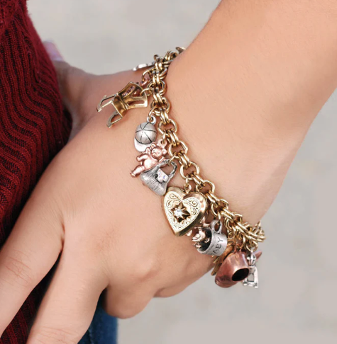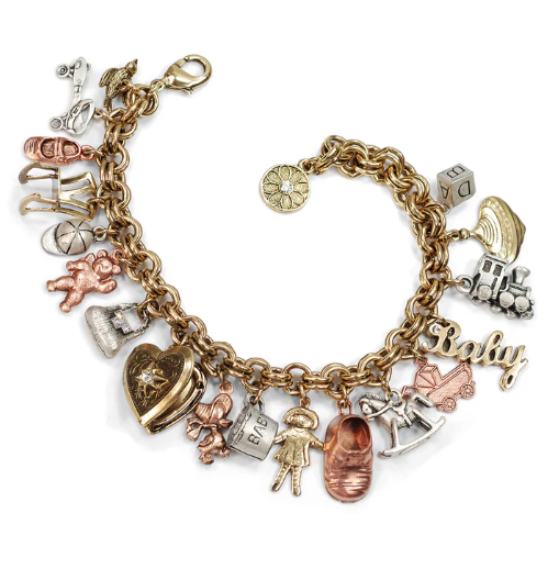 This is a bracelet of dear little treasures. Dimensional charms convey the message of BABY! Great style and tender sentiment is expressed in tiny vintage charms. Charms created with the original dies of the 1940s all have the theme of children. Building block, top, maryjane shoe, mother's rocking chair, the word "baby", roller skate, favorite doll, baby bootie, teddy bear, toy train, ducky, rocking horse and vintage pram. Substantial, detailed and so giftable -- for all moms and expecting mothers.