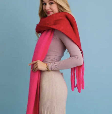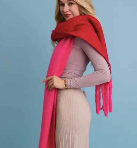 Wrap yourself in warmth and style with our cozy red & pink color-block scarf. The soft fabric, playful tassels and fun colors make it the perfect accessory for chilly days.
