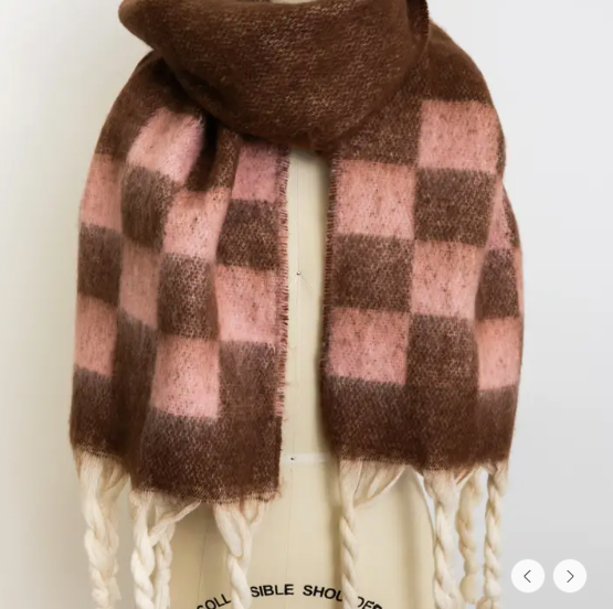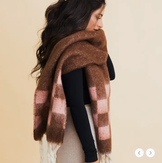 Wrap yourself in cozy warmth this fall and winter with this chunky plaid oversized scarf. Featuring a bold checkered design and playful fringe detail, it’s the ultimate accessory to elevate your cold-weather outfits.