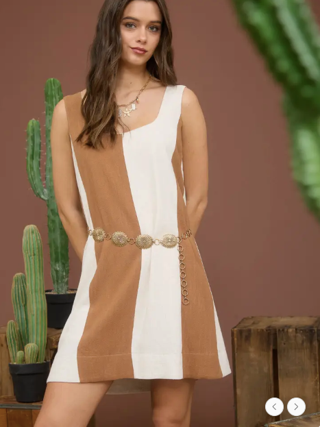 Relaxed fit linen blend dress with lining, and a bold mocha stripe!