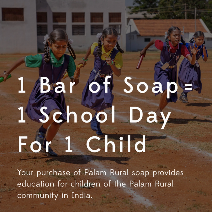 Handcrafted in India by the master soap makers of Palam Rural where one bar of soap sends one child to school for one day.
