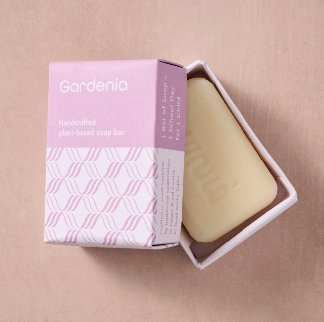 Luxuriate in the delicate fragrance of blooming gardenias with this delightfully fragrant all-natural soap. Expertly crafted with nourishing hydrogenated rice bran, coconut and mohua oils, each bar gently cleanses while moisturizing your skin. Infused with pure essential oils, this soap offers a lush, floral escape that's naturally beautiful. Handcrafted in India by the master soap makers of Palam Rural where one bar of soap sends one child to school for one day.