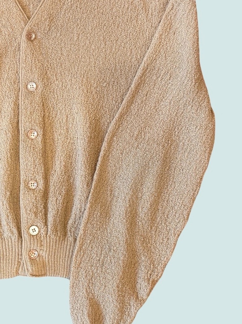 This Vintage men's cardigan is a curly knit and branded Jantzen 100. The neutral tan color makes it a versatile choice for your vintage wardrobe. Size and material not marked, would fit a size Small or Medium best. Cotton blend.
