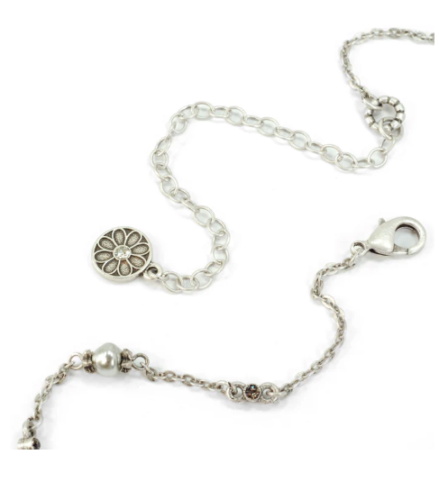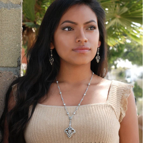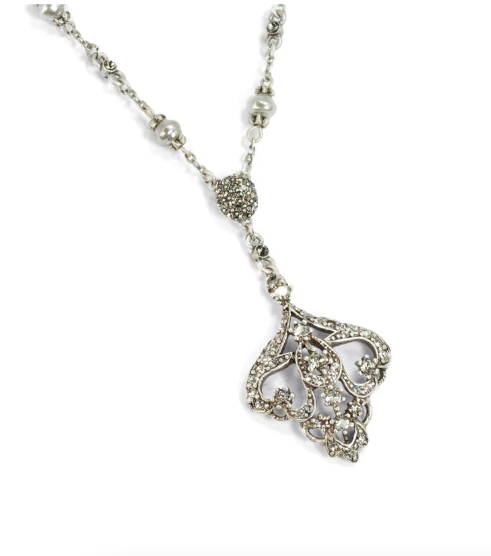 This graceful art deco openwork necklace design, called an arabesque, is set with premium crystal stones. It is suspended from a pave crystal centerpiece. Continuing in a long Y silhouette of quality baroque pearls and delicate vintage cable chain. 23" L + 4" extender Designed and made at Sweet Romance in Los Angeles studio.