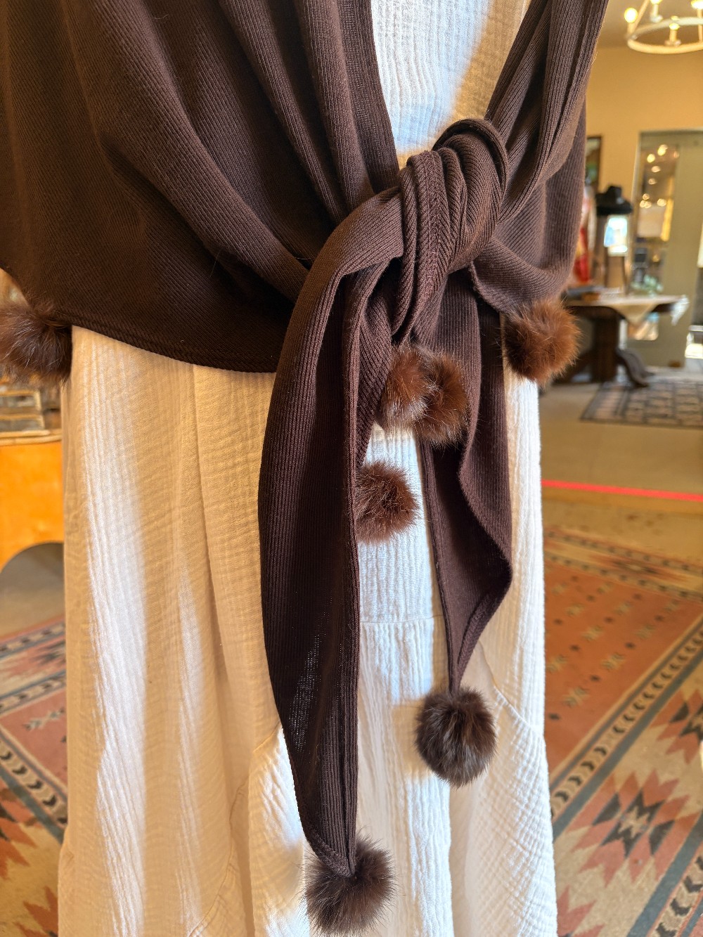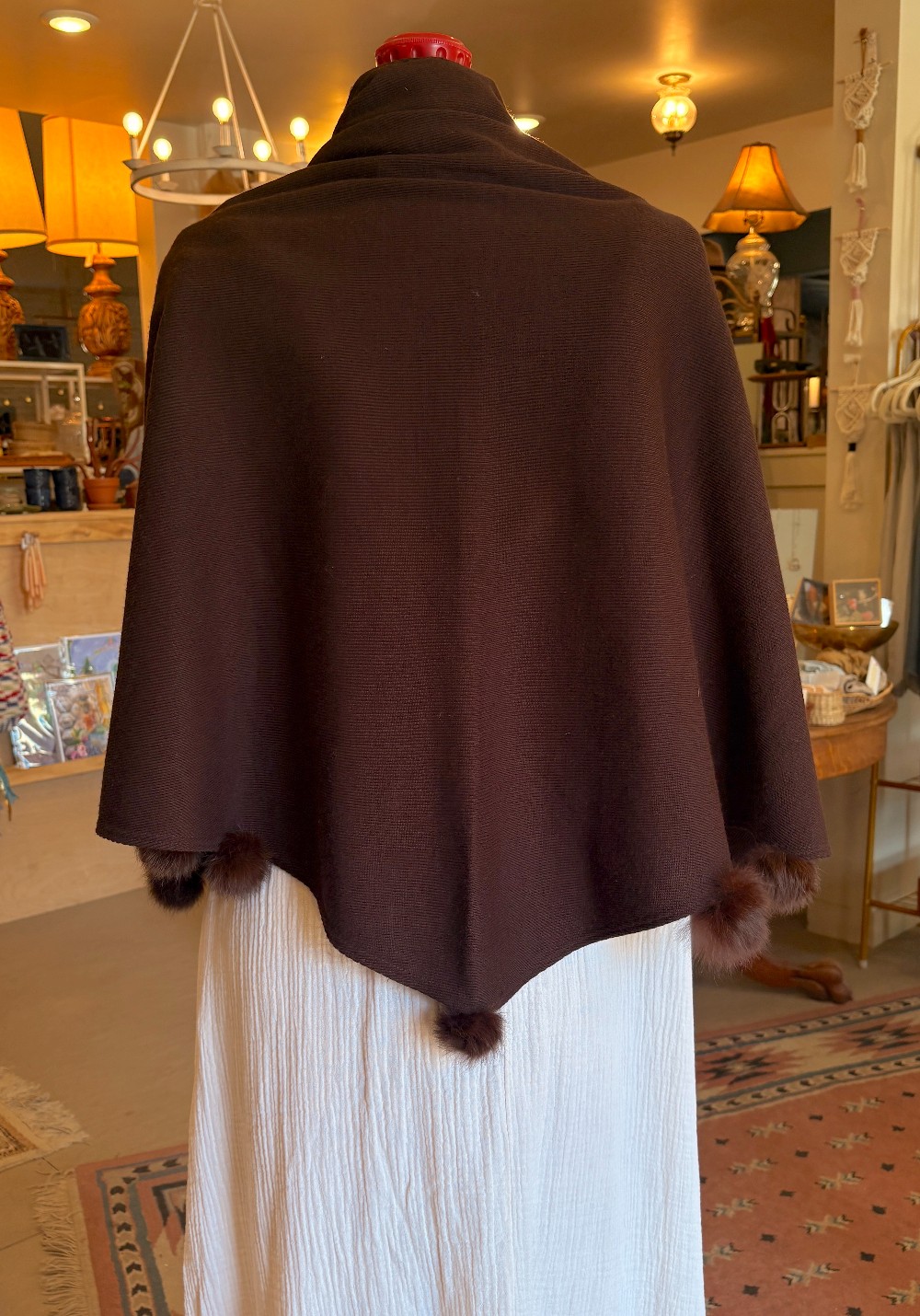 This vintage shawl is fabulous! Dark brown color with real rabbit fur pom poms adorning the edges. Branded Lennie New York. Materials Unlisted.