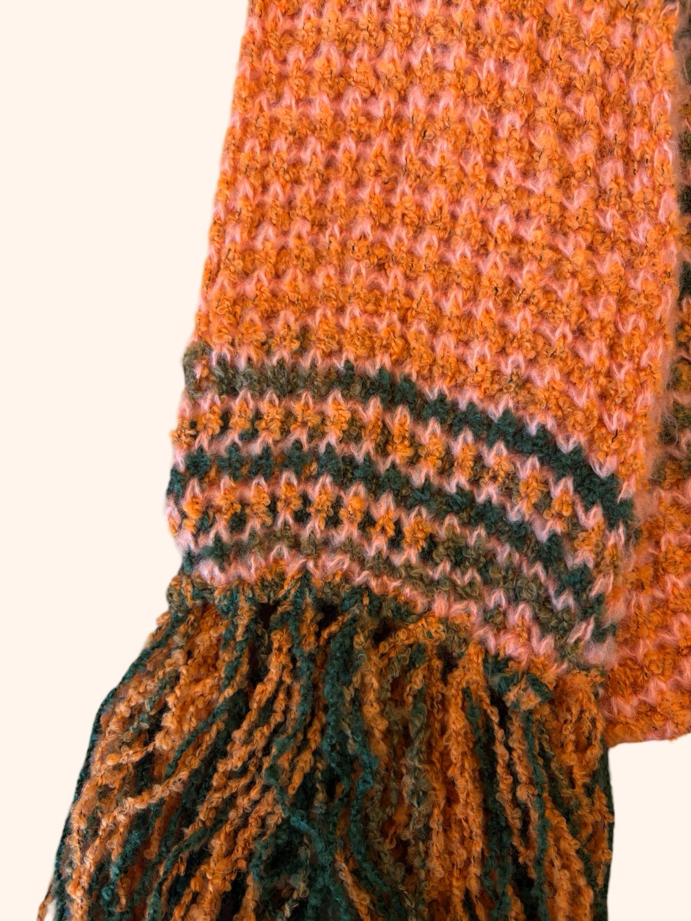 This vintage scarf is so soft! The extra long length means you can wrap it about a couple times, and the fringe is long and fun. The knit is a mix of orange, pink and dark green.