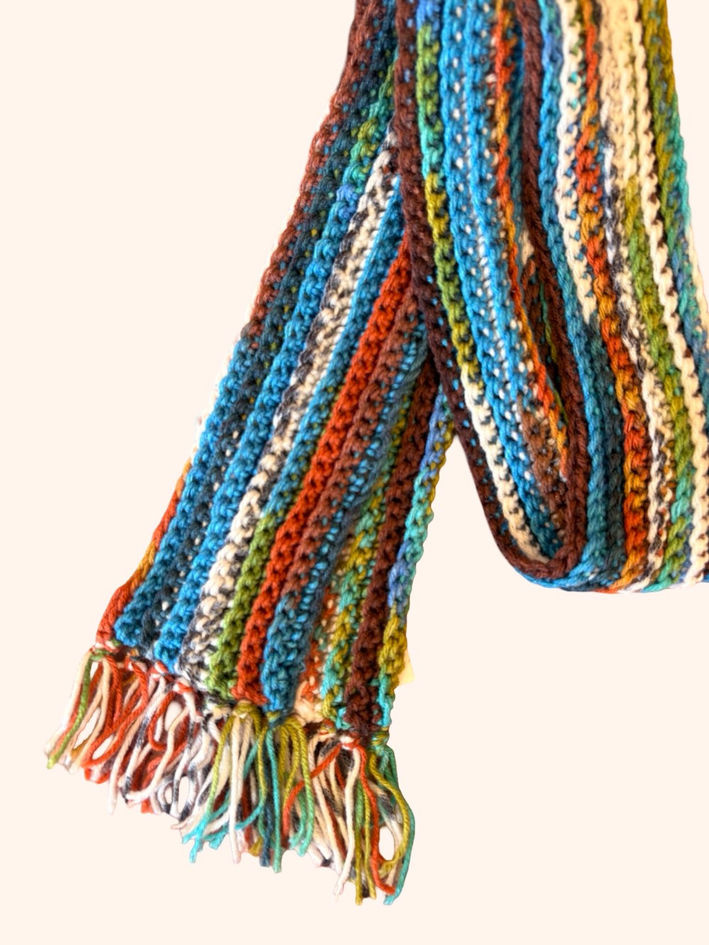 These colors! So cool! A vintage skinny scarf, knitted and handmade. Shades of blue, teal, green, orange and brown make this scarf a fun addition to any wardrobe. Handmade :)