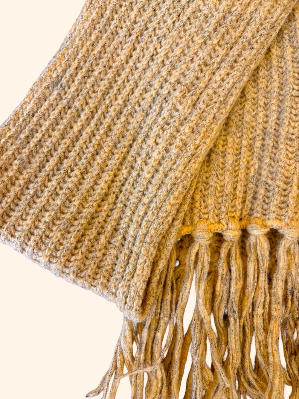 This vintage mustard yellow scarf is soft & has a slightly heathered color. Hand knit, vintage and cute tassels!