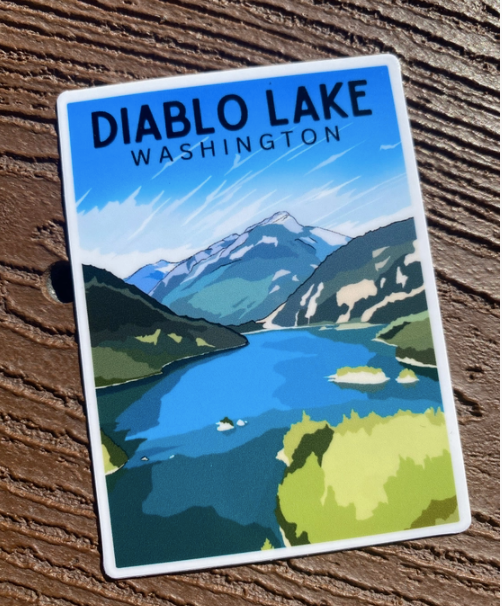 2x3" glossy sticker featuring the classic view of Diablo Lake in North Cascades National Park in Washington. It's waterproof and UV-protected and works great on your laptop, water bottle, and more.