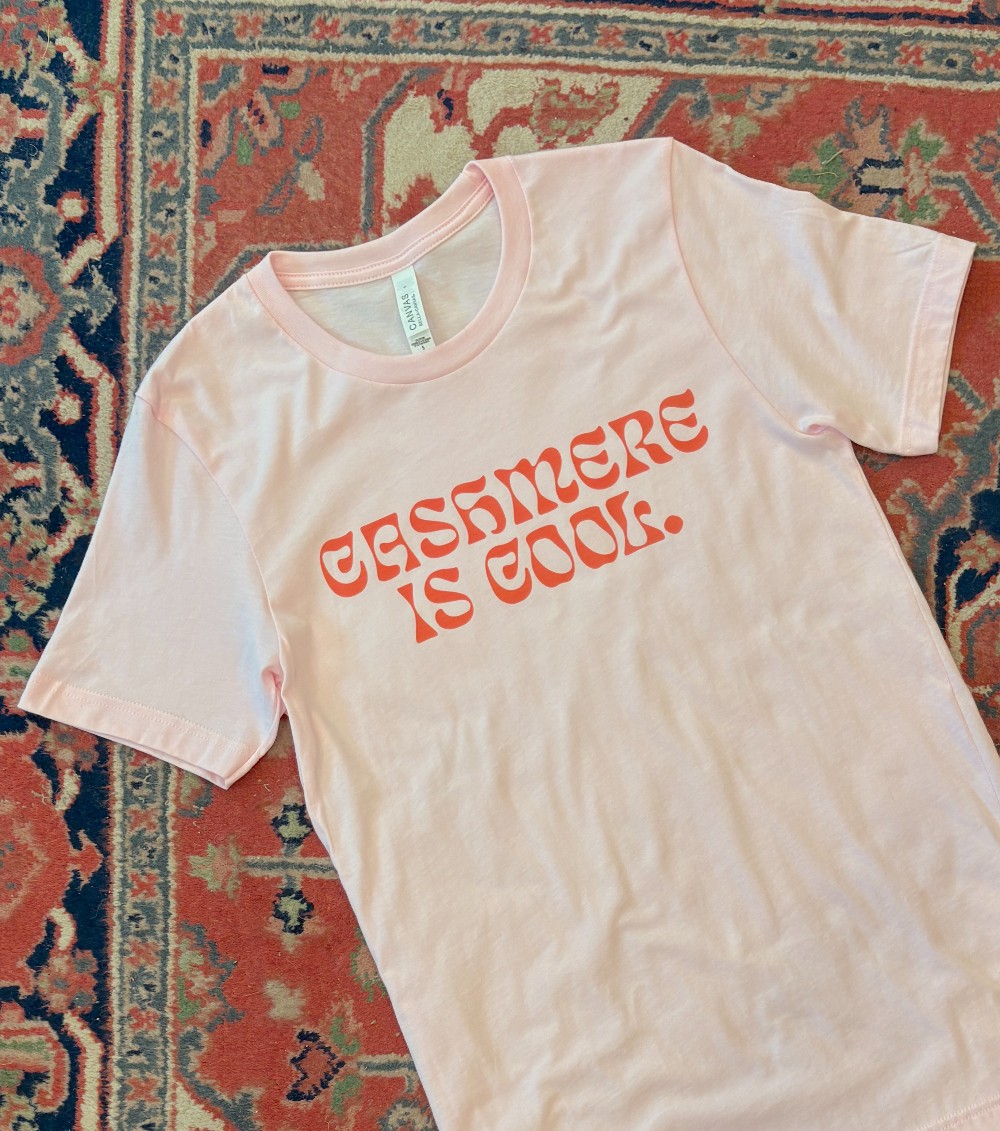 Cashmere is Cool! Our classic graphic in coral pink on a baby pink background. Bella & Canvas poly cotton blend T-shirt. Made in house.