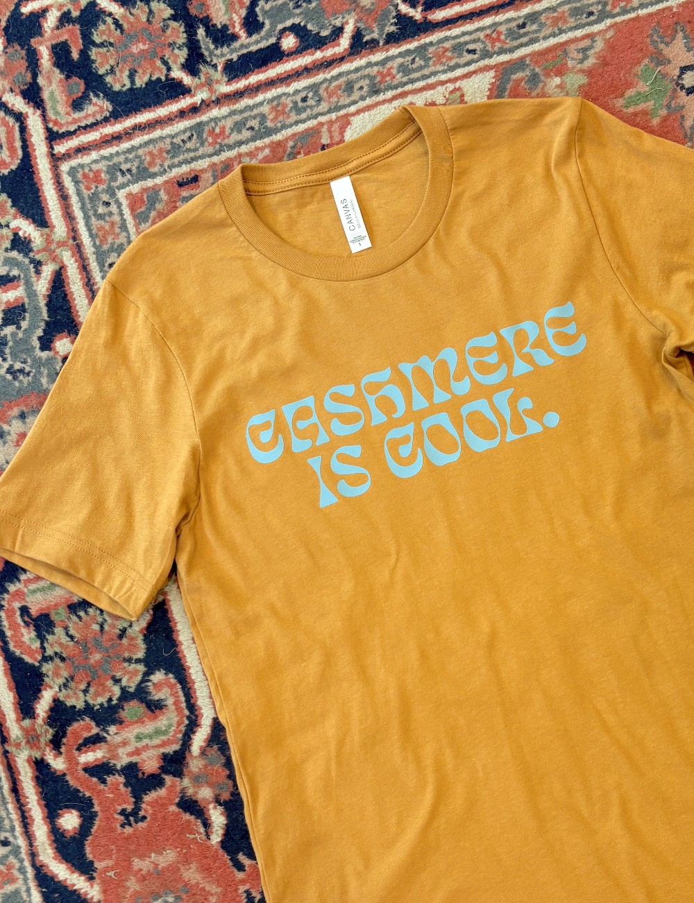 Cashmere is Cool! Our classic graphic in light & bright blue on a dusty orange background. Bella & Canvas poly cotton blend T-shirt. Made in house.