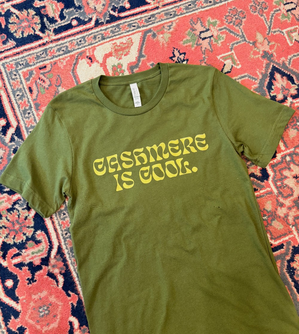 Cashmere is Cool! Our classic graphic in bright avocado green on a dark army green background. Bella & Canvas poly cotton blend T-shirt. Made in house.