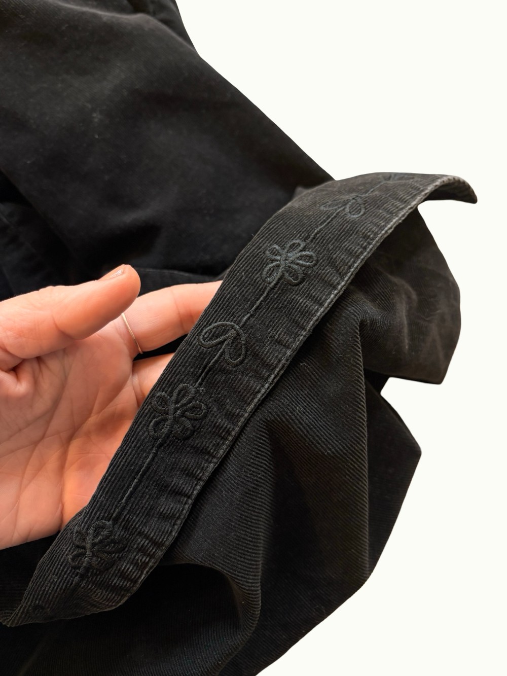 This vintage micro cord shirt is soft and adorable. Black color with floral details embroidered on the collar all the way around. Vintage Gloria Vanderbilt signature label. Size Medium.