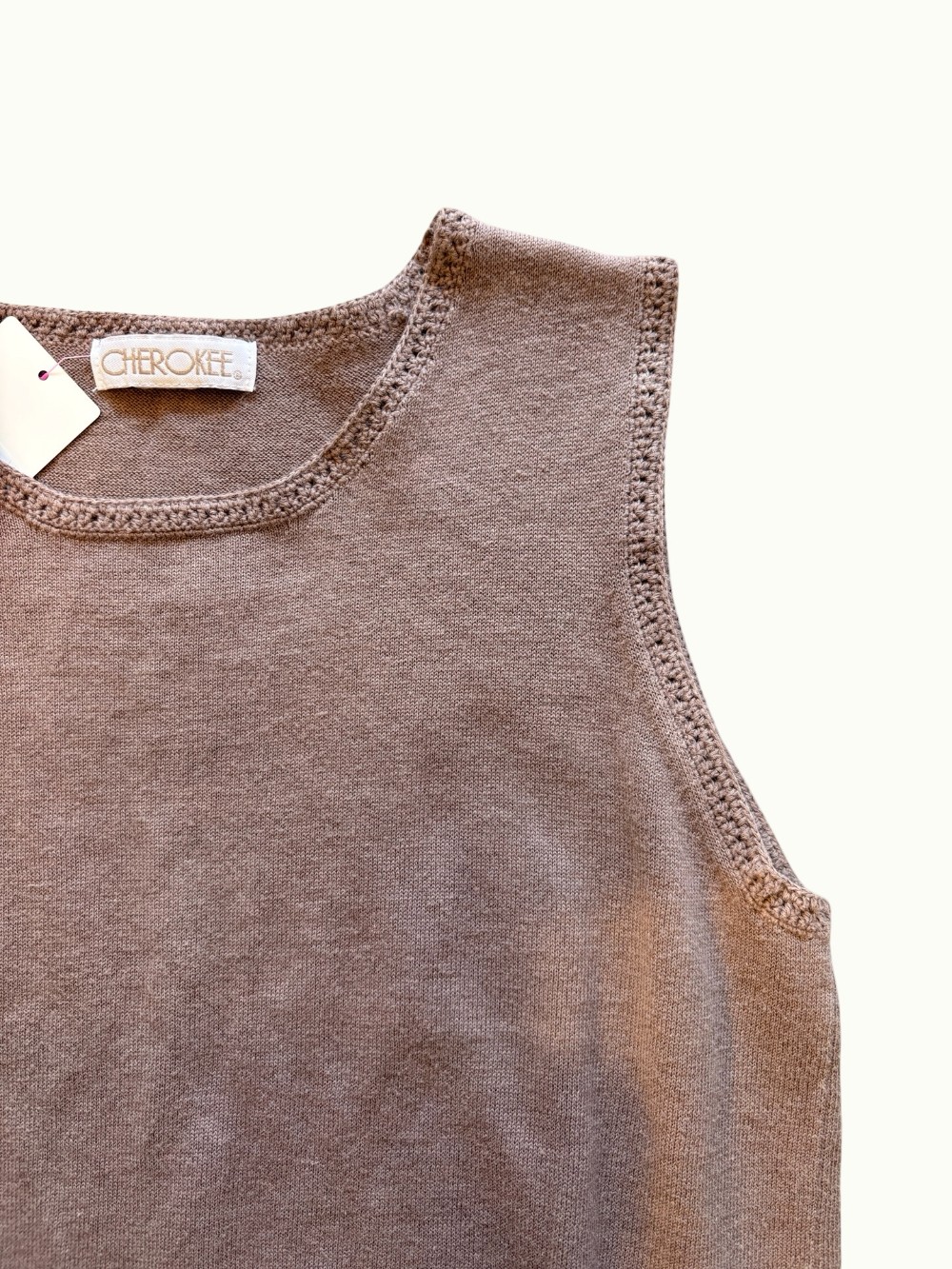 This vintage cotton shell is perfect for layering and has a soft mocha brown color. Vintage Cherokee with crochet detail at the edges. Size Medium.