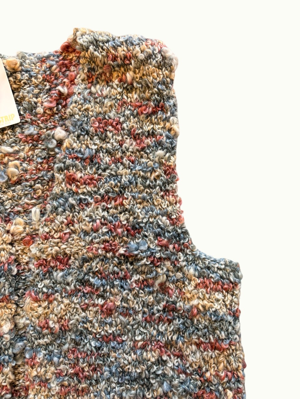 This handmade vintage vest is knitted and adorable. Has a curly sheeplike texture in funky cream, blue and mauve. Size & Brand not marked. Will fit well as a size Small or Medium.