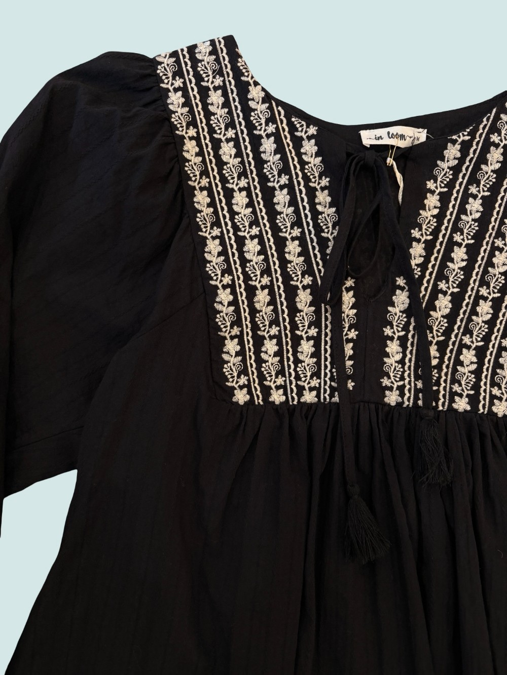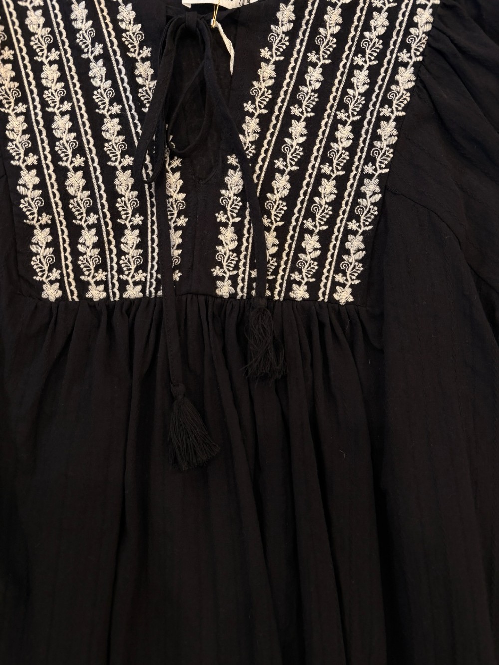 This black In Loom brand peasant top is cotton and so sweet. Embroidered down the chest with white flowers, and has two little tassels to tie at the front. The material has a subtle floral embroidery across the entirety.