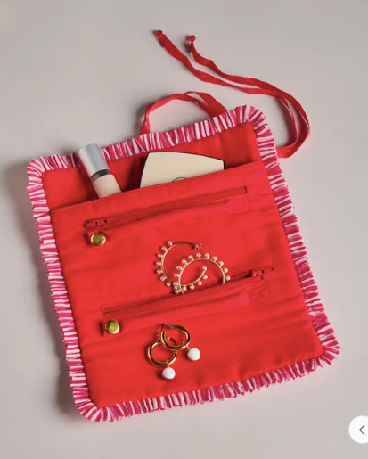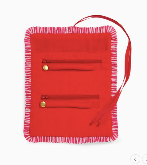 Keep your jewelry cute and contained with the Celeste Jewelry Roll. Crafted from soft cotton velvet and trimmed in candy-striped ruffles, this travel essential is as fun as it is functional. Inside, you’ll find zippered pockets, snap tabs, and a beaded tie closure to keep your treasures safe and organized on the go. A sweet way to store your sparkle..