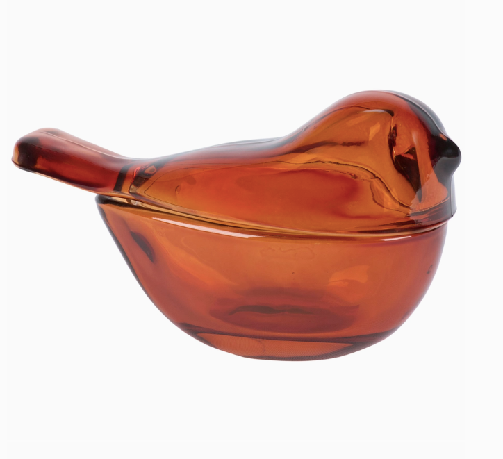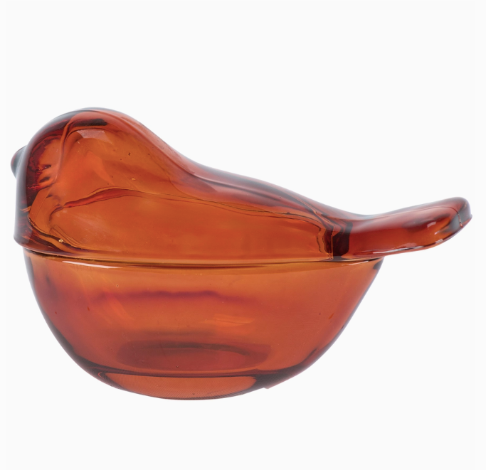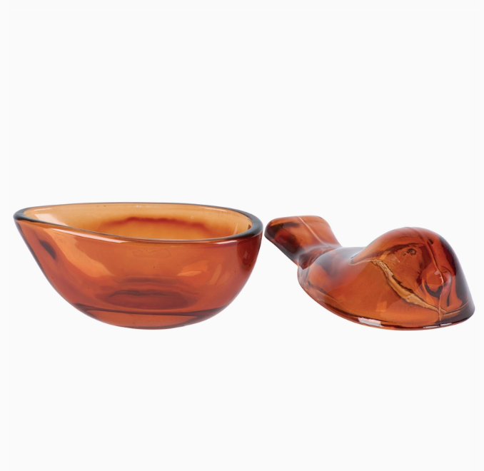 A decorative jar in amber glass. The top half of the bird opens to store items inside.